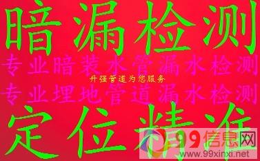 专业从事地下水管漏水检测管道漏水探测,自来水管漏水检测、消防管漏水检测,地下水管漏水,水表转速过快、水的压力太小、消防管的压力保不住,消防稳压泵总是自己启动等等……这些现象都是地下供水管道漏水的表现,还在为漏水点在哪里而发愁烦恼,公司配备进口 13099986857 的超声波漏水检测仪、电子测漏仪、管线探测仪等测漏设备,在不开挖的情况下,帮您准确的定位漏水点范围,探测出埋在地下漏水点的具体位置,大大减少开挖量,及早的开挖。专业探测地下管道漏水、市政管道漏水、各种小区地下管道漏水、大型管道漏水、各种物业小区漏水等等来源www.99xinxi.net